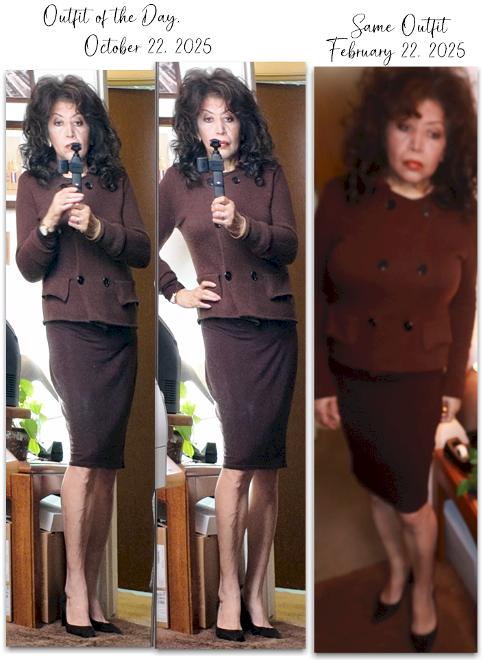 In February 2025, I tried on the outfit I wore yesterday. The photo on the right shows how the outfit fit then- versus the two on the left that show the fit as of yesterday.